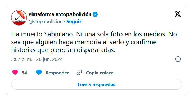 Pues ellas ya se han manifestado en contra mediante su plataforma Stop Abolición, a propósito de los dos días que su presunto vástago se ha tomado de asueto a cuenta el óbito de don Sabiniano, “el de las putisaunas”.